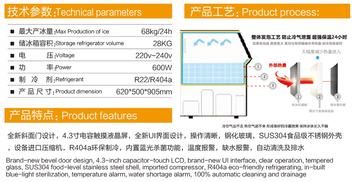 全新斜面门设计,4.3寸电容触摸液晶屏,全新UI界面设计,操作清晰,钢化玻璃,SUS304食品级不锈钢外壳,设备进口压缩机,R404a环保制冷,内置蓝光杀菌功能,温度报警,缺水报警,自动清洗及排水。