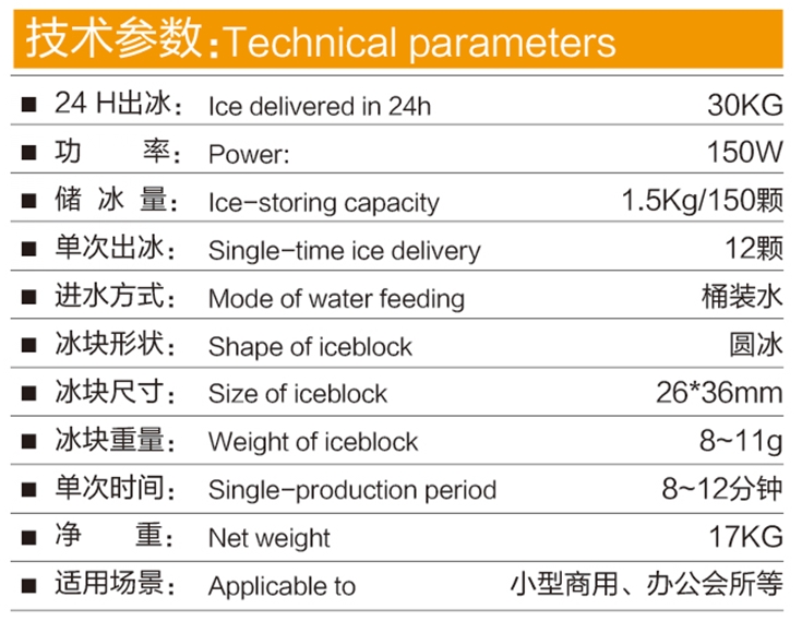 工程级控制板,超大体积储冰箱,高密度箱式发泡,故障修复提示功能,智能化水自动清洗,冰厚调节功能,高温报警,缺水报警,食品级硅胶管件。