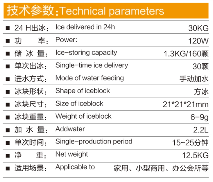 工程级控制板,超大体积储冰箱,高密度箱式发泡,故障修复提示功能,智能化水自动清洗,冰厚调节功能,高温报警,缺水报警,食品级硅胶管件。