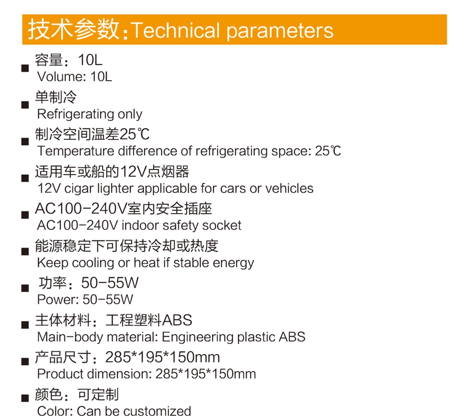 容量10L,单制冷,制冷空间温差25度,适用车或船的12V点烟器,能源稳定下可保持冷却或热度