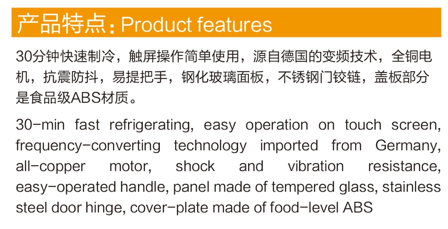 30分钟快速制冷,触屏操作简单使用,源自德国的变频技术,全铜电机,抗震防抖,易提把手,钢化玻璃面板,不锈钢门铰链,盖板部分是食品级ABS材质。